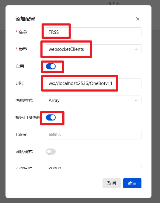 • URL:前面云崽日志输出过的连接地址,但是只保留OneBotv11的部分,即: ws://localhost:2536/OneBotv11